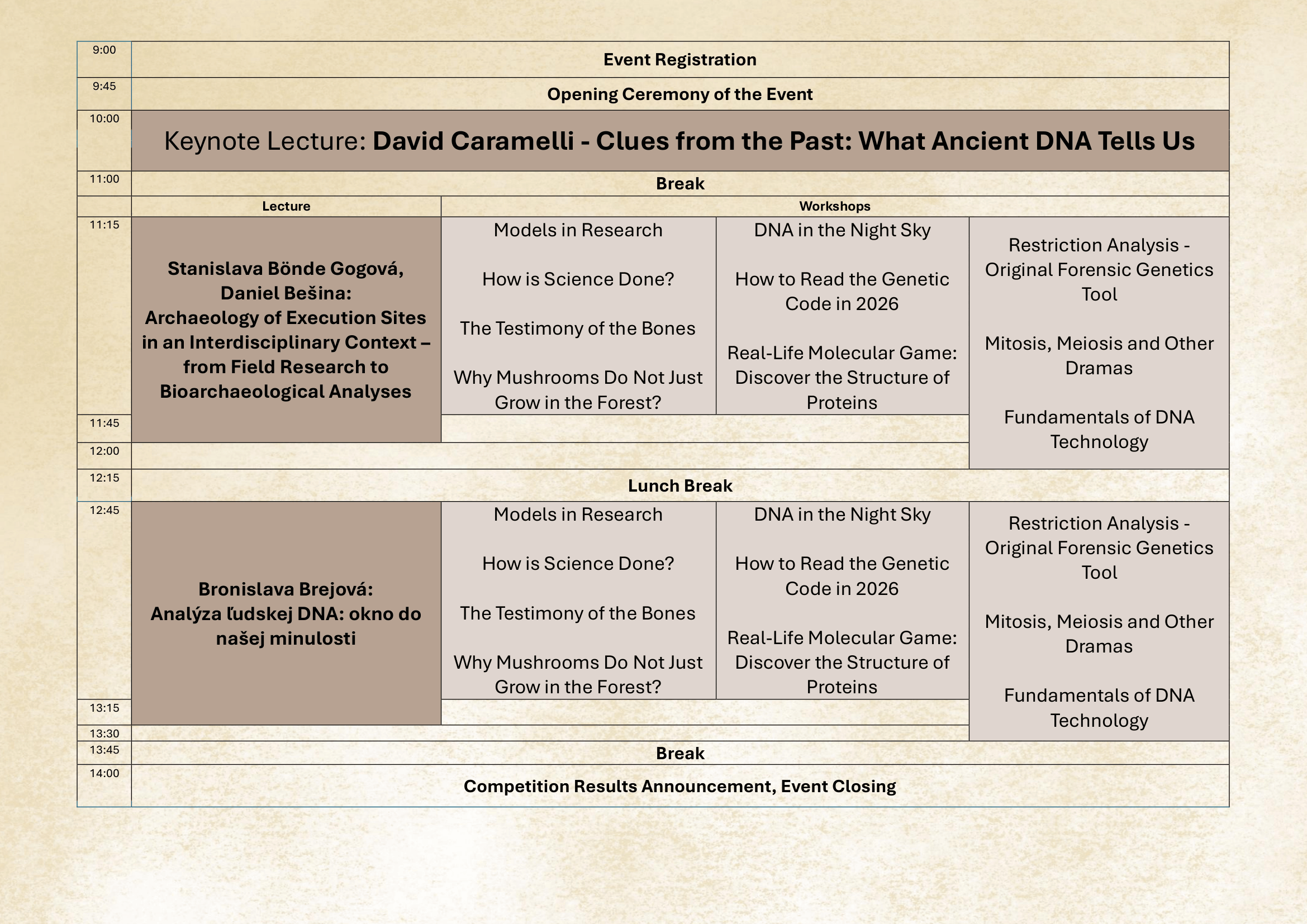 Throughout the day, there will be a poster session and interactive booths – research workplaces of the Faculty of Natural Sciences, the Faculty of Medicine of Comenius University, and the Slovak Academy of Sciences, presenting their research and study programs.